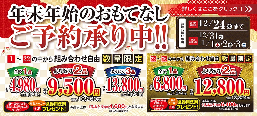 オードブル&チキン、もっちりピザのご予約期間は12月21日(日)までです。